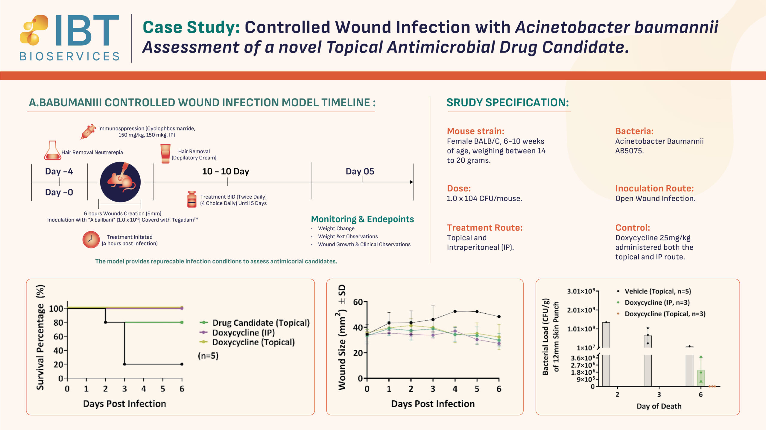 Capabilities: Evaluate topical vs. systemic (IP) delivery; Wound Area; standardized back titration; and longitudinal tracking of infection via BLI.